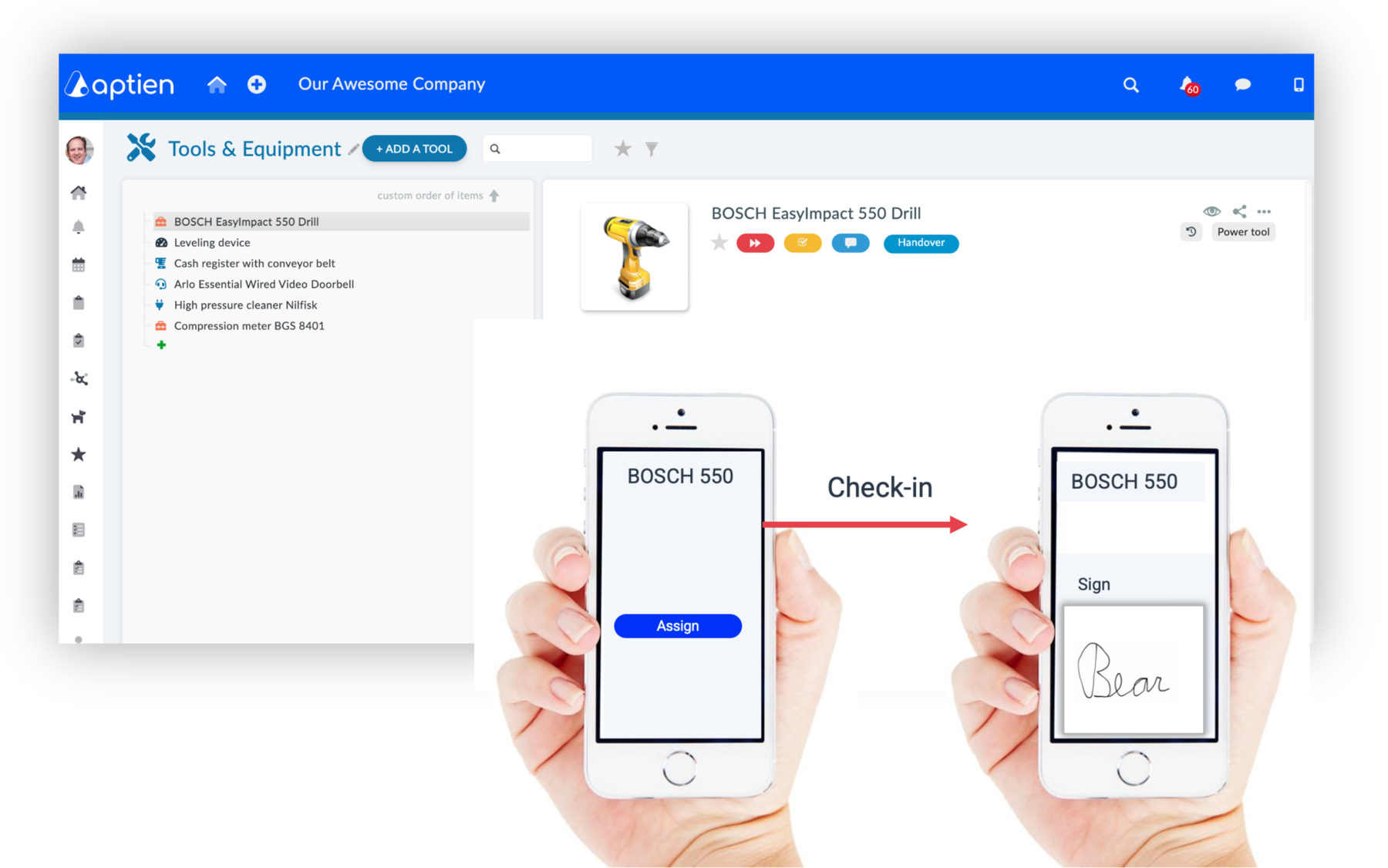Track all your tools and work equipment. Manage maintenance and work equipment checkouts. Assign or handover any equipment to your employees using application with digital forms.
