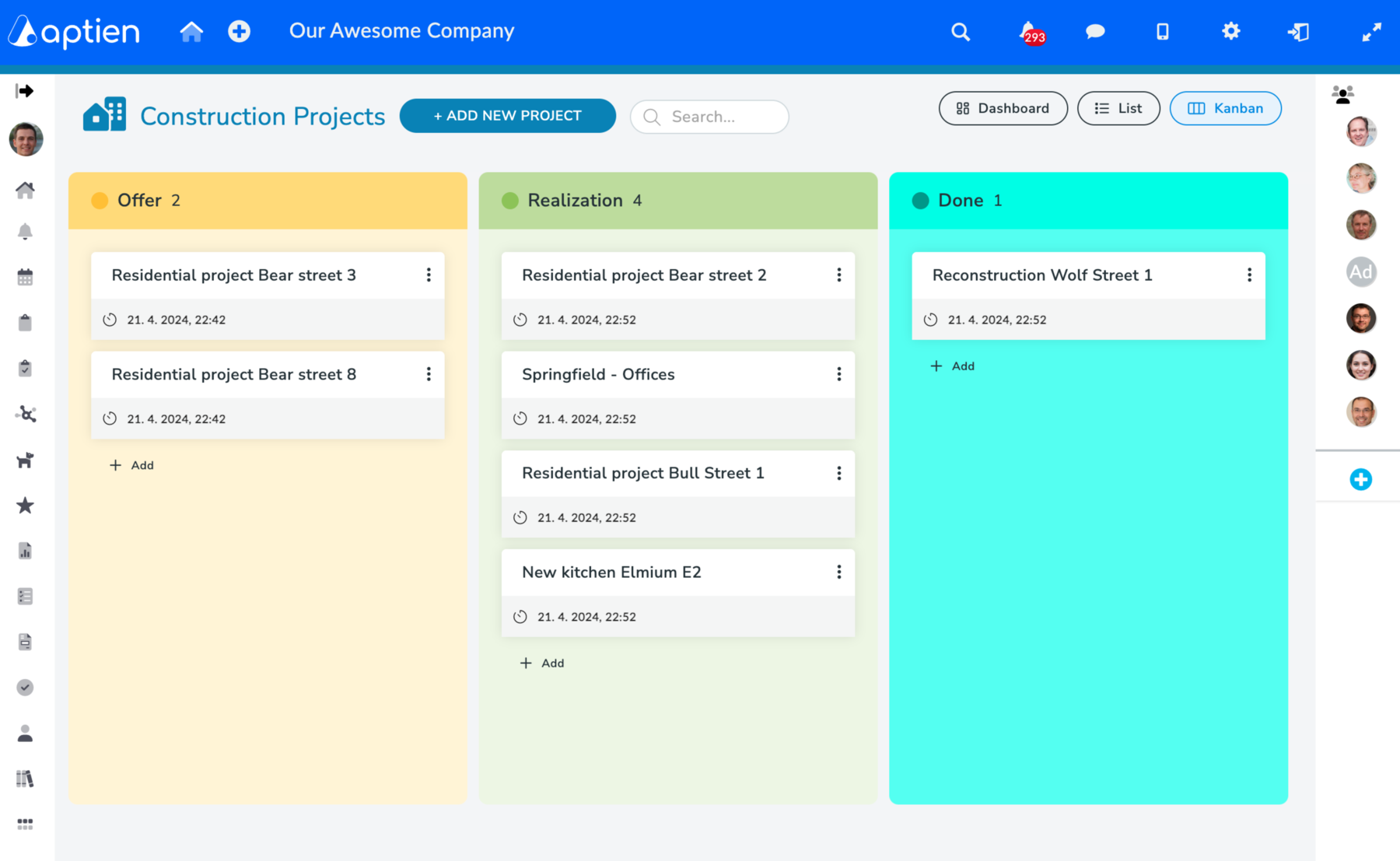manage all your construction project from sales to delivery. Dashboard with kanban overview of all your construction projects in one place, whether they are in the supply, demand or delivery phase.