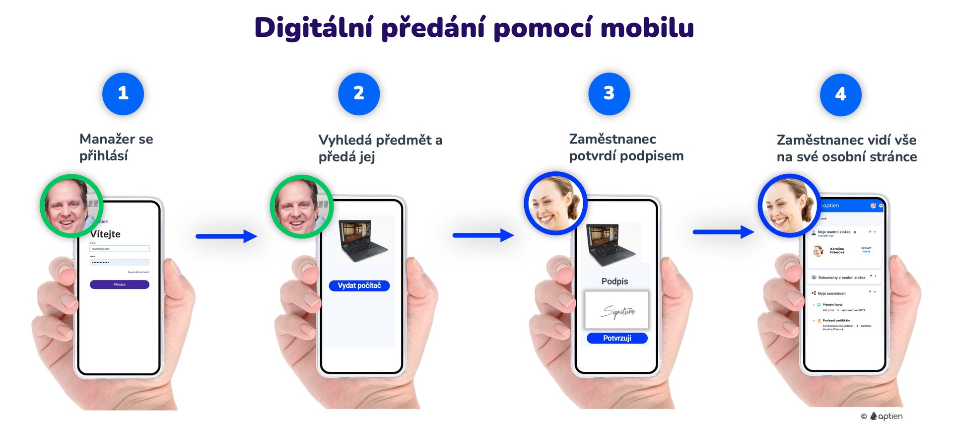 - Zaměstnanec převzetí digitálně potvrzuje a vidí ve své osobní složce, co mu bylo vydáno.
