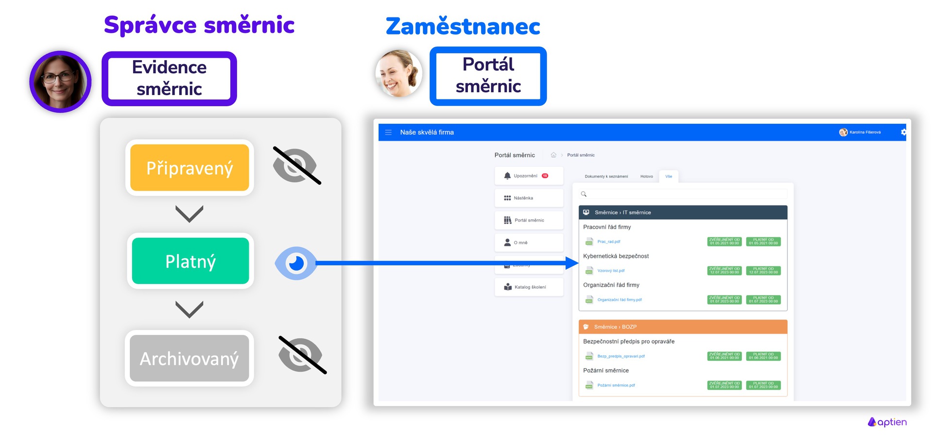 Jako správce směrnic máte pod kontrolou, jaké dokumenty se budou zaměstnancům na portálu zobrazovat. Jsou to pouze platné verze příslušných předpisů. Dokumenty, které jsou v přípravě nebo archivované se na portálu nezobrazují. Tyto verze vidíte pouze vy v evidenci Směrnic.