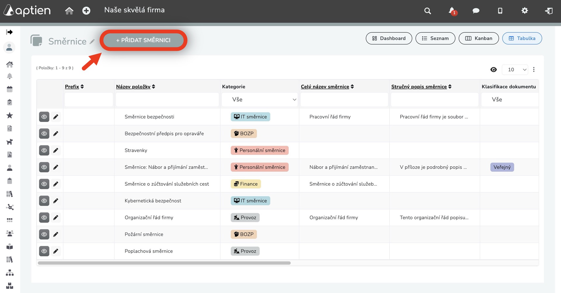 Směrnice a interní dokumenty ve vaší firmě máte jako správce směrnic v evidenci Směrnice. Přidání nového dokumentu, jako je směrnice, interní předpis nebo firemní pravidlo, je první krok k jasné evidenci a správě pravidel ve vaší organizaci. V Aptienu můžete tento proces provést jednoduše a efektivně tak, aby zaměstnanci vždy viděli pouze aktuální verzi pravidel ale vy jako správce směrnic budete mít přehled celém o jejich životním cyklu (od přípravy až po archivaci).