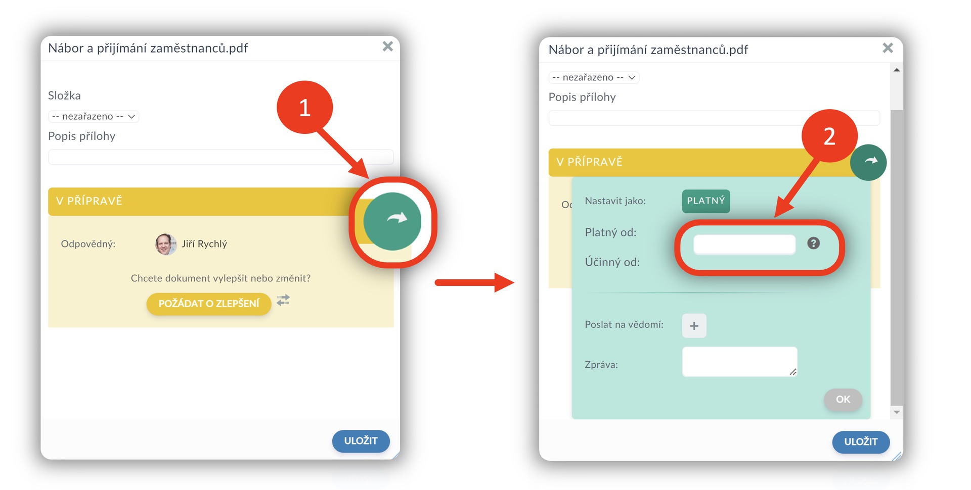 - Klikněte na zelenou šipku v pravém rohu žlutého rámečku pro zveřejnění dokumentu (nastavíte pomocí platnosti)