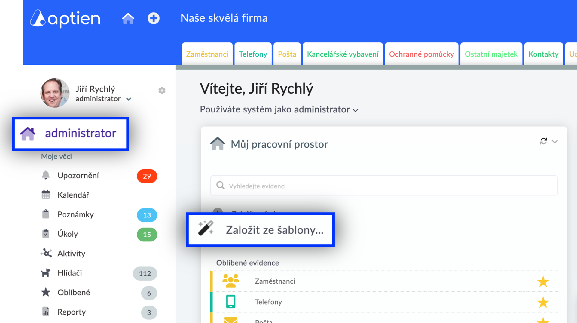 Pokud nechcete "klikat evidenci od nuly", můžete využít buď naši knihovnu šablon nebo použijete vlastní uloženou šablonu nebo šablonu zaslanou od experta, který vám ji poskytne. Takovou šablonu si můžete do svého Aptienu nahrát dále uvedeným postupem a systém automaticky vytvoří novou, již připravenou evidenci.