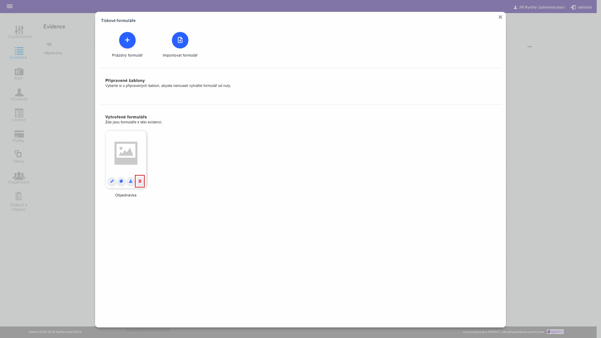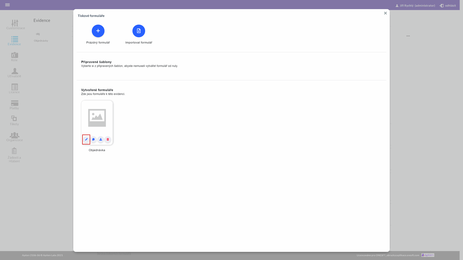 Tiskové formuláře může upravovat administrátor pro kteroukoliv evidenci v administraci evidence.
