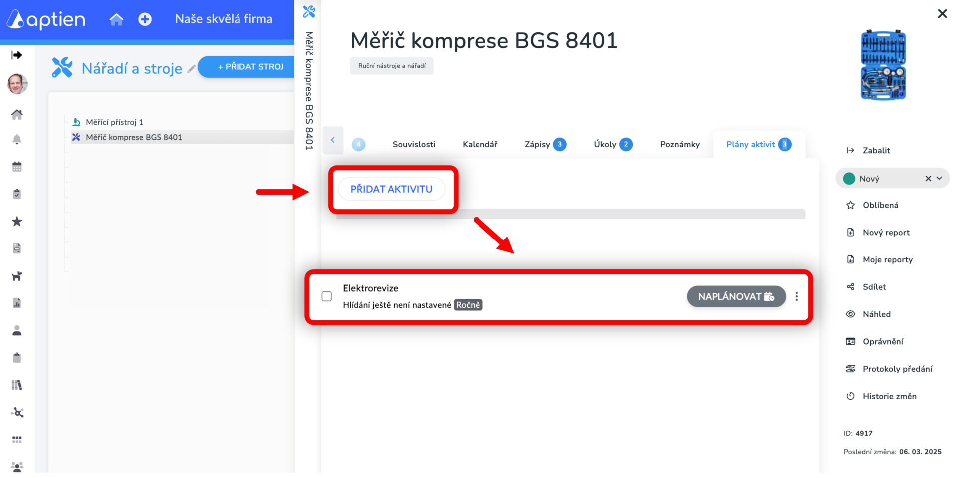 K plánování a hlídání termínů revizí a kontrol a následnému potvrzování provedených revizí použijete plány aktivit.