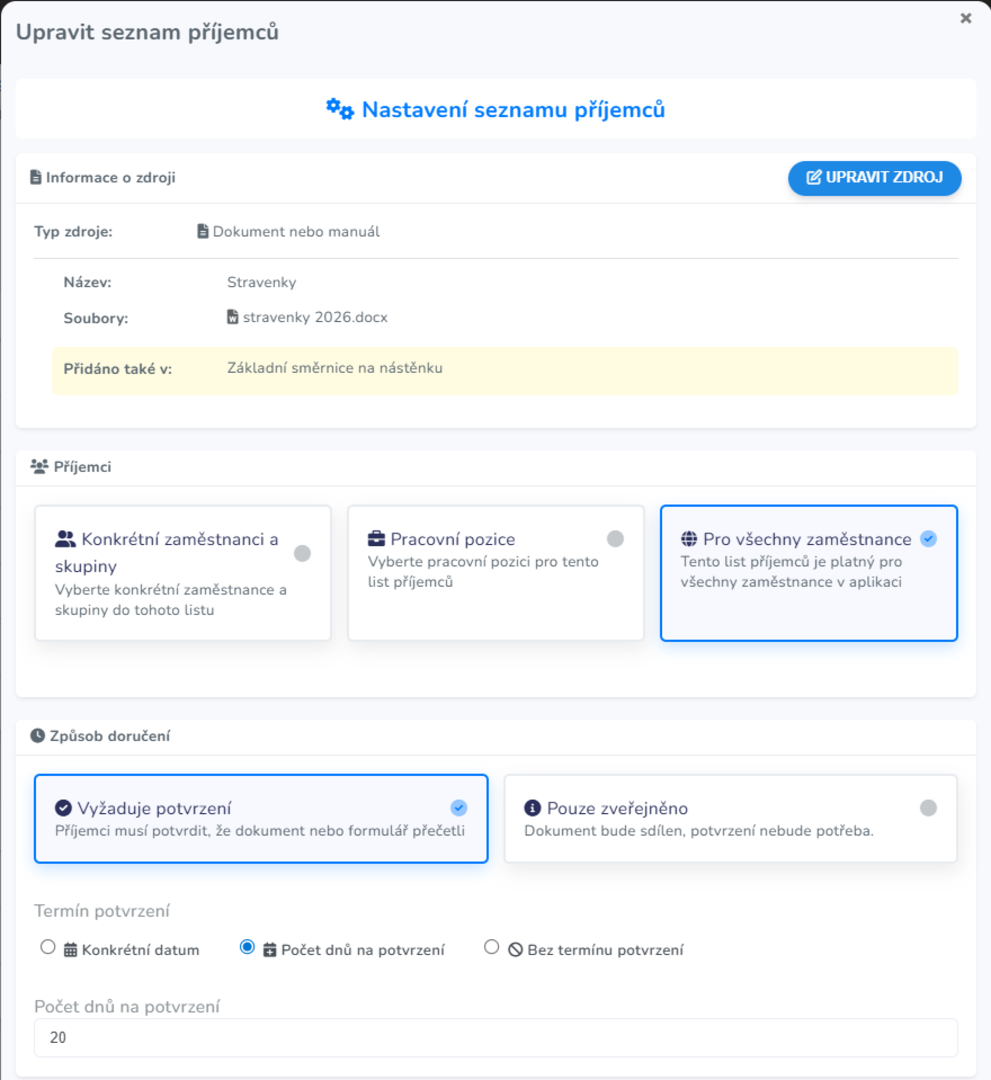 - Vyberte zdroj, tedy dokument, se kterým se musí příjemci seznámit.