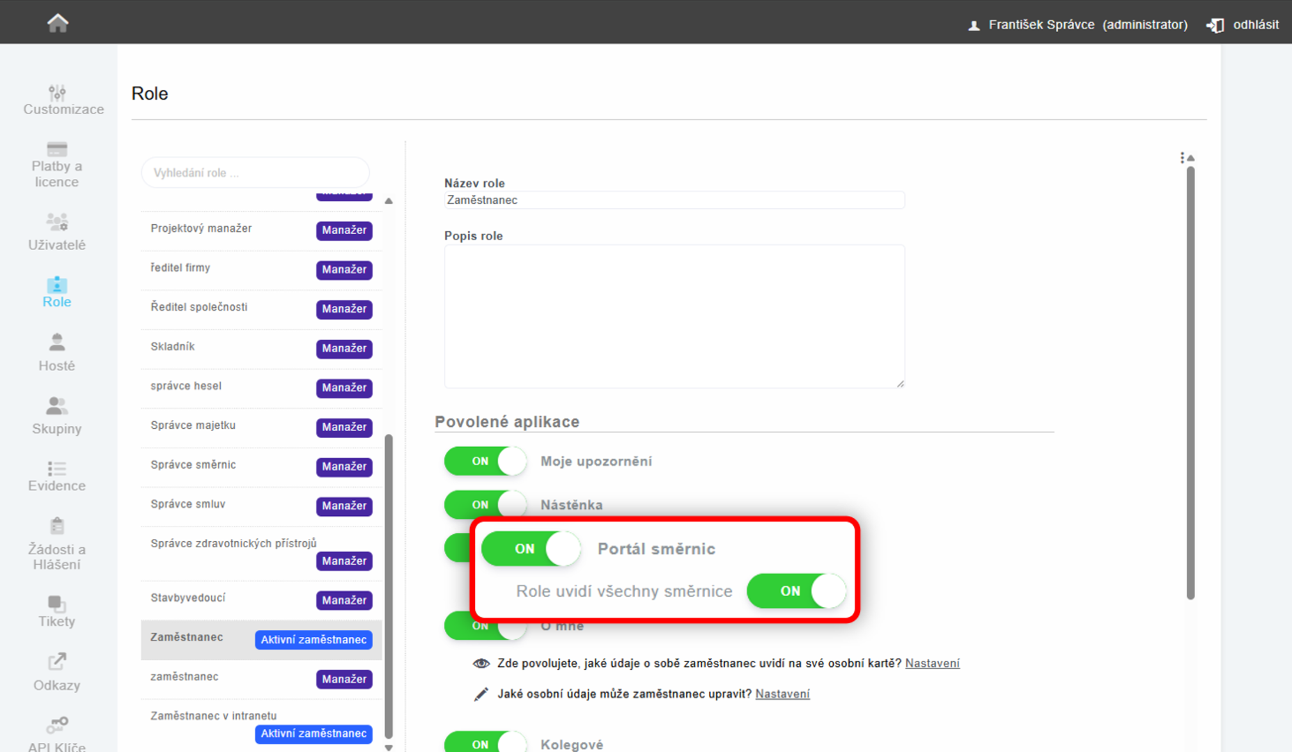 - Portál směrnic je volitelný a jako administrátor máte možnost jeho viditelnost zapnout nebo vypnout pro každou jednotlivou konkrétní roli.