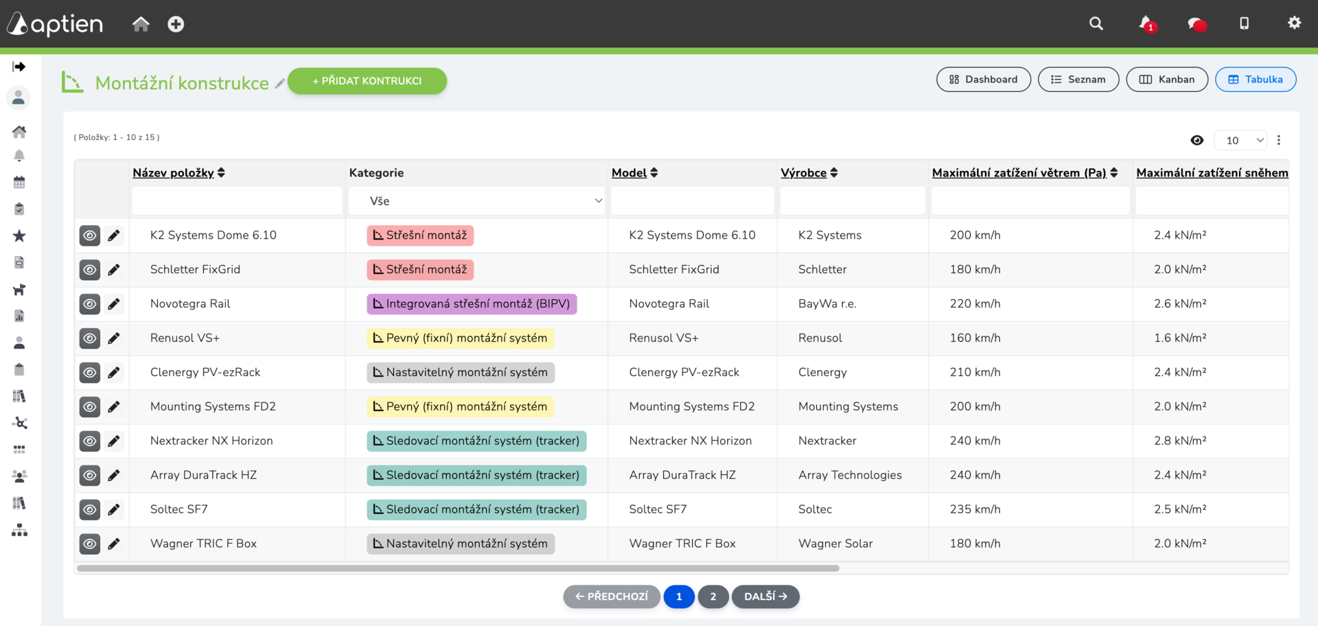- V evidenci montážních konstrukcí vedete seznam všech modelů konstrukcí, které jste instalovali nebo instalujete u vašich klientů.