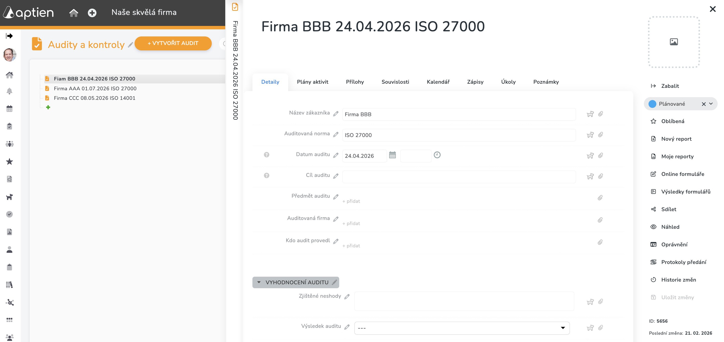Moderní auditní systém pro plánování, provádění a plánování auditů a kontrol.