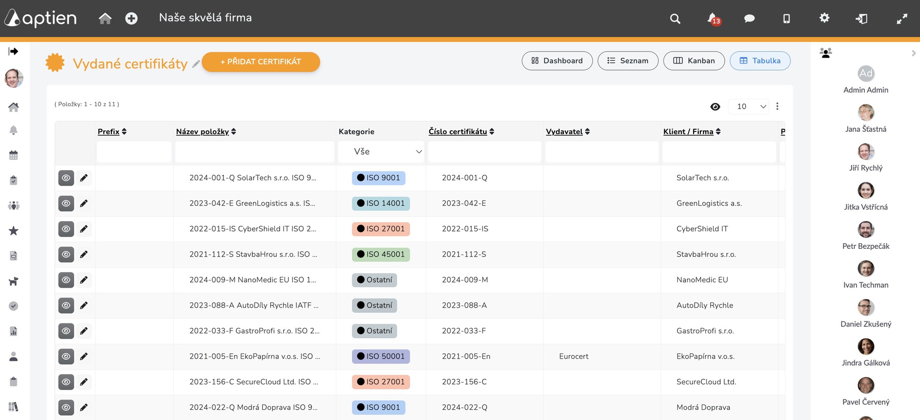 Ať se jedná o termíny auditů, vydaných certifikátů nebo cokoliv jiného, Aptien vám vše automaticky připomene.
