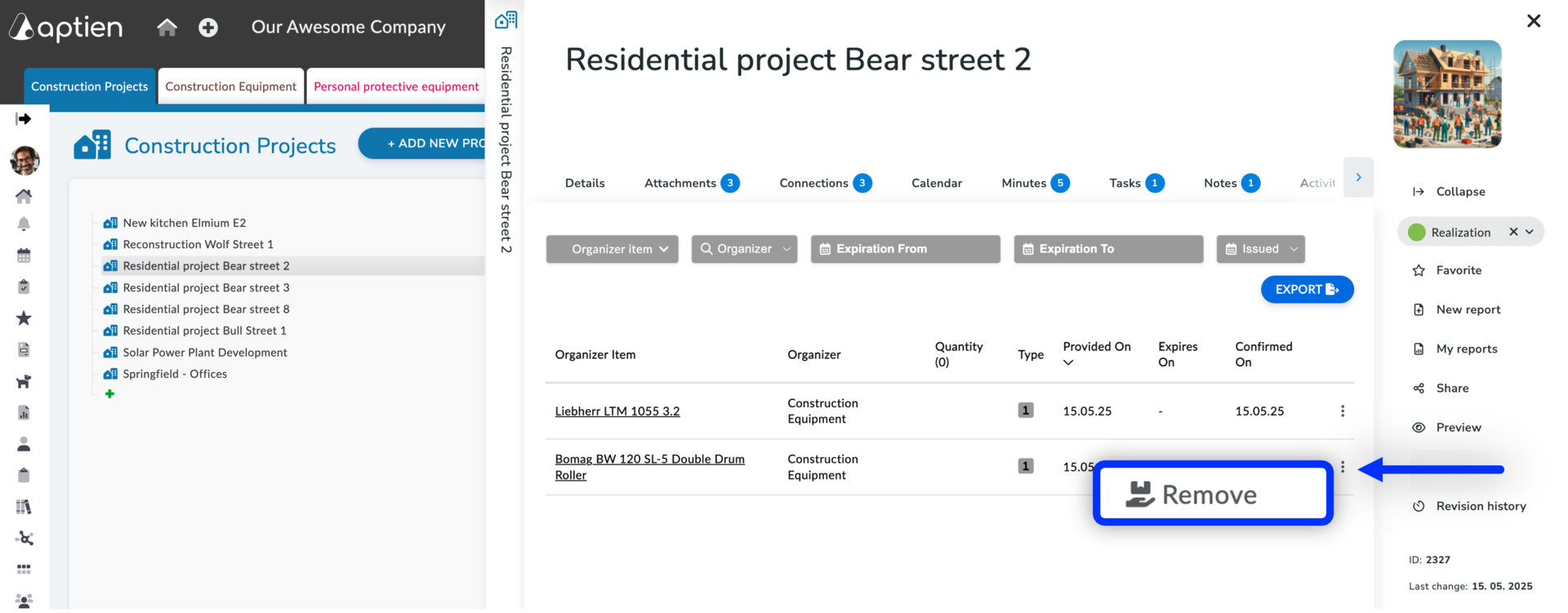 - Open the construction site page where you want to manage the equipment