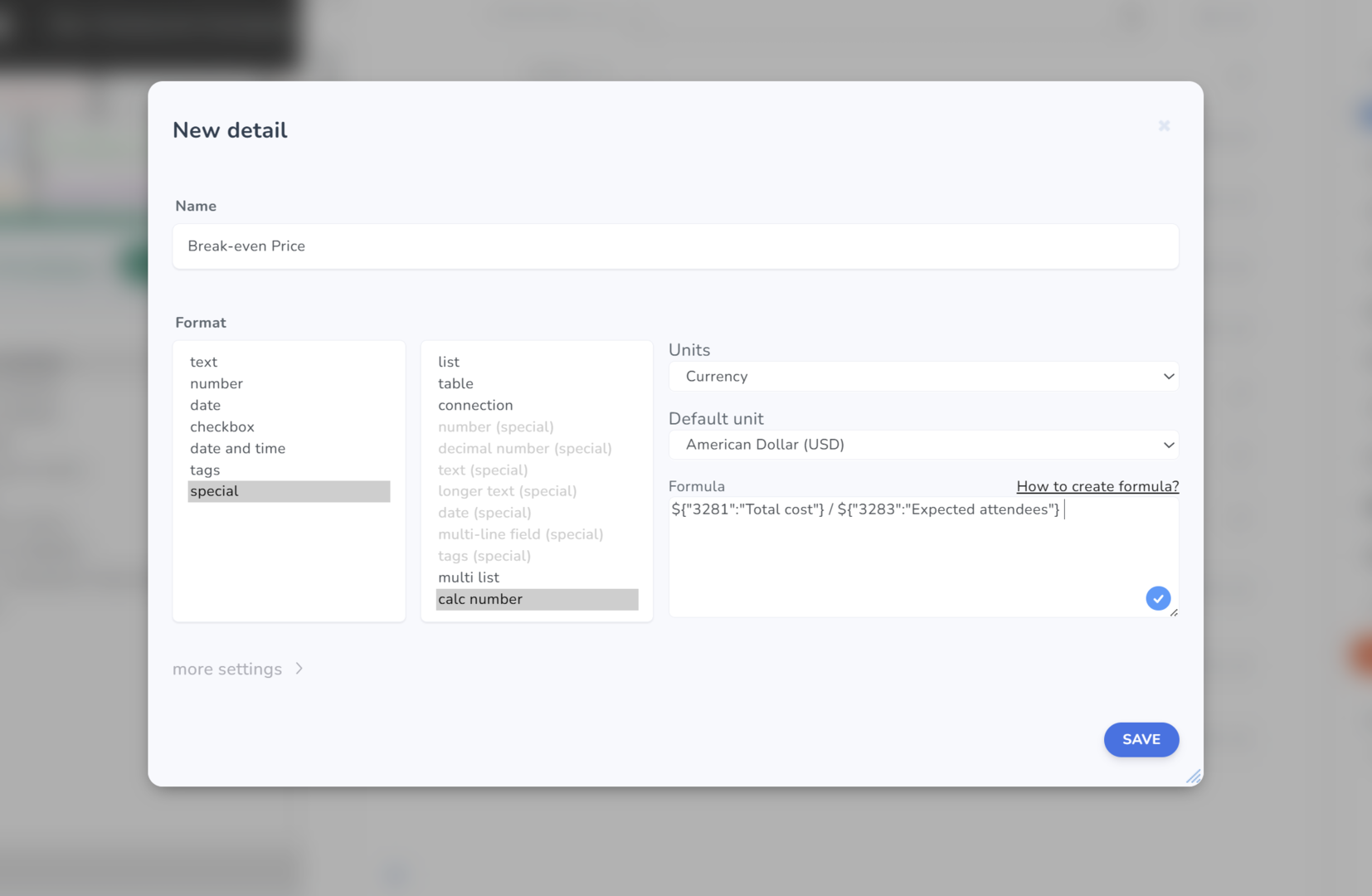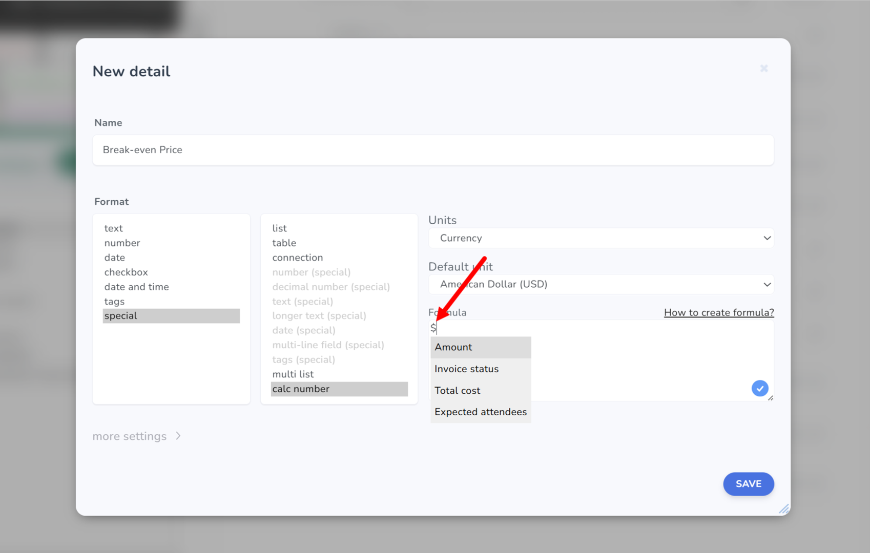 To choose the correct formula, you need to set the right initial values—specifically, select the record detail from which the value will be calculated. To see a list of available details you can use, start by typing the dollar sign $